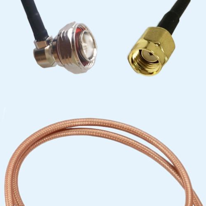 Low Loss Cable Assembly, 7/16 DIN Male Right Angle to RP SMA Male 50 Ohm, RG142 Cable, Low VSWR.