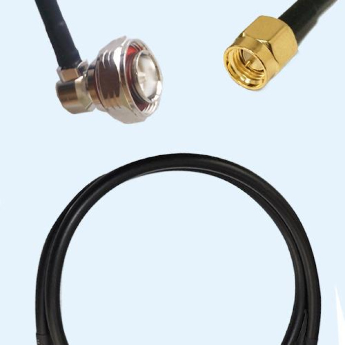Low Loss Cable Assembly, 7/16 DIN Male Right Angle to SMA Male 50 Ohm, RG223 Cable, Low VSWR.