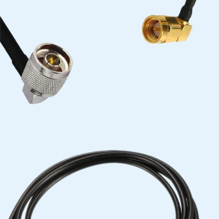 Low Loss Cable Assembly, N Male Right Angle to SMA Male Right Angle 50 Ohm, RG174 Cable, Low VSWR.