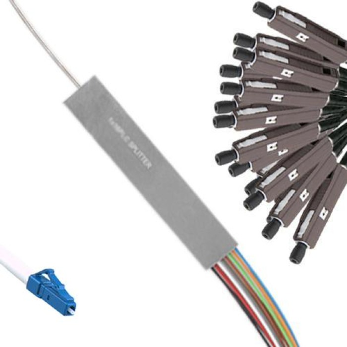 1x16 LC/UPC to MU/UPC Mini-Module PLC Splitter, Wavelength 1260nm ~ 1650nm, G657A 9/125 Singlemode, Cable Jacket 0.9mm, Length 1 Meter on Each Side by Default or Custom.