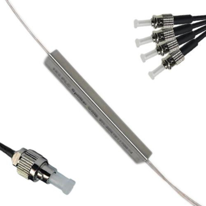 1x4 FC/UPC to ST/UPC Mini-Module PLC Splitter, Wavelength 1260nm ~ 1650nm, G657A 9/125 Singlemode, Cable Jacket 0.9mm, Length 1 Meter on Each Side by Default or Custom.
