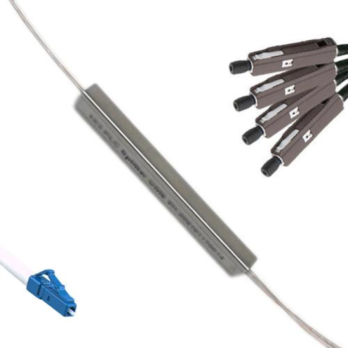 1x4 LC/UPC to MU/UPC Mini-Module PLC Splitter, Wavelength 1260nm ~ 1650nm, G657A 9/125 Singlemode, Cable Jacket 0.9mm, Length 1 Meter on Each Side by Default or Custom.