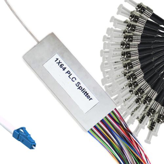 1x64 LC/UPC to ST/UPC Mini-Module PLC Splitter, Wavelength 1260nm ~ 1650nm, G657A 9/125 Singlemode, Cable Jacket 0.9mm, Length 1 Meter on Each Side by Default or Custom.