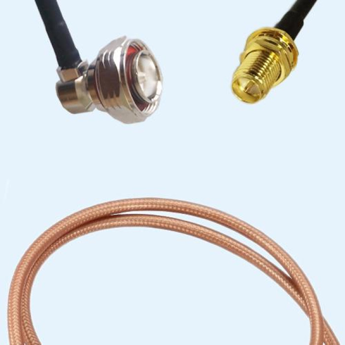 Low Loss Cable Assembly, 7/16 DIN Male Right Angle to RP SMA Bulkhead Female 50 Ohm, RG142 Cable, Low VSWR.