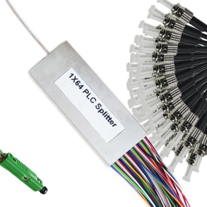 1x64 MU/APC to ST/UPC Mini-Module PLC Splitter, Wavelength 1260nm ~ 1650nm, G657A 9/125 Singlemode, Cable Jacket 0.9mm, Length 1 Meter on Each Side by Default or Custom.