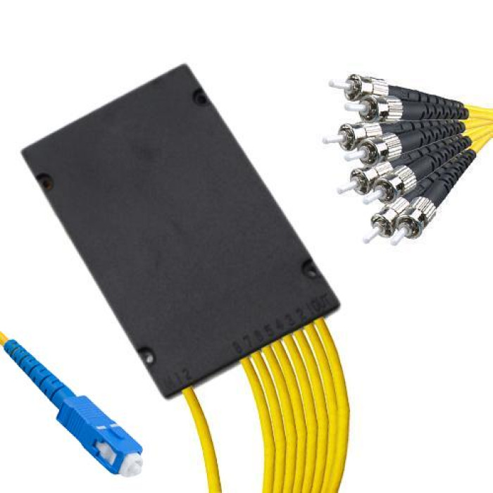 1x8 SC/UPC to ST/UPC Module PLC Splitter, Wavelength 1260nm ~ 1650nm, G657A 9/125 Singlemode, Cable Jacket 2.0mm, Length 1 Meter on Each Side by Default or Custom.